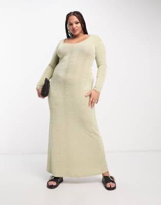 Vestido largo verde salvia de manga larga con cuello de pico de ASOS DESIGN Curve