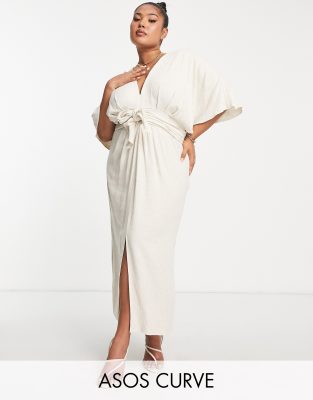 Vestido midi beis con lazada delantera de lino de ASOS DESIGN Curve