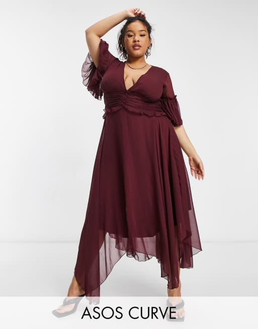 Vestido midi color baya con mangas acampanadas, cintura plisada y detalle de botón de ASOS DESIGN Curve