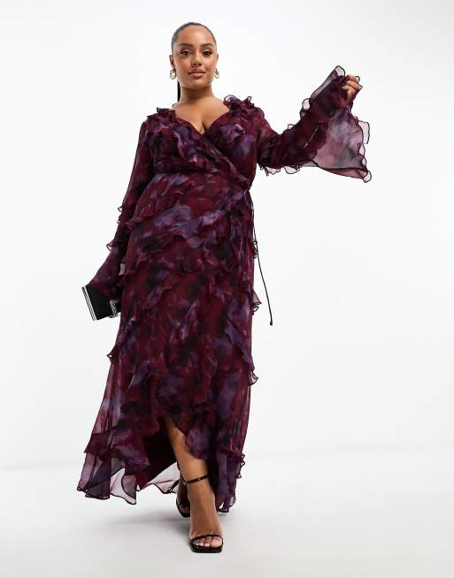 Vestido midi con bajo asimétrico, volantes y estampado floral difuminado exclusivo de ASOS DESIGN Curve