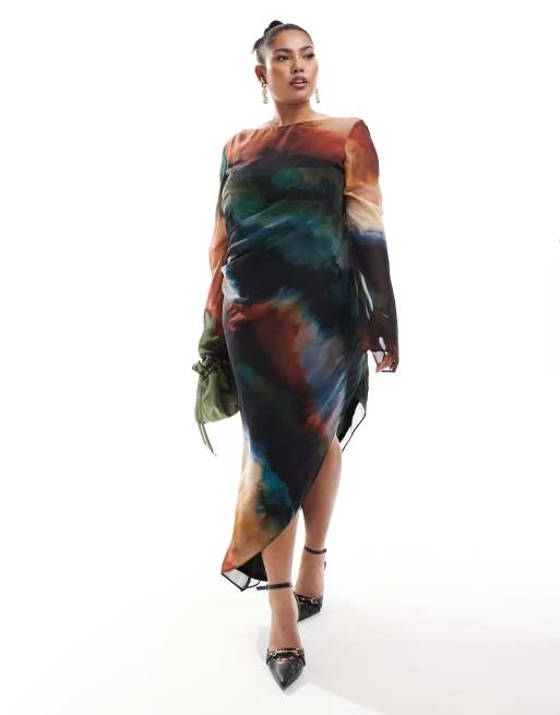 Vestido midi con estampado marmolado, cuello barco y bajo asimétrico de chifón de ASOS DESIGN Curve