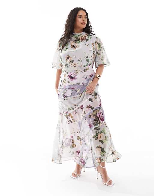 Vestido midi lila con estampado floral, mangas 3/4, cuello alto y abertura de ASOS DESIGN Curve