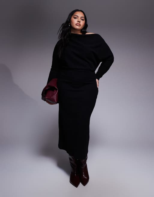 Vestido midi negro de manga larga con hombro caído de tejido muy suave de ASOS DESIGN Curve