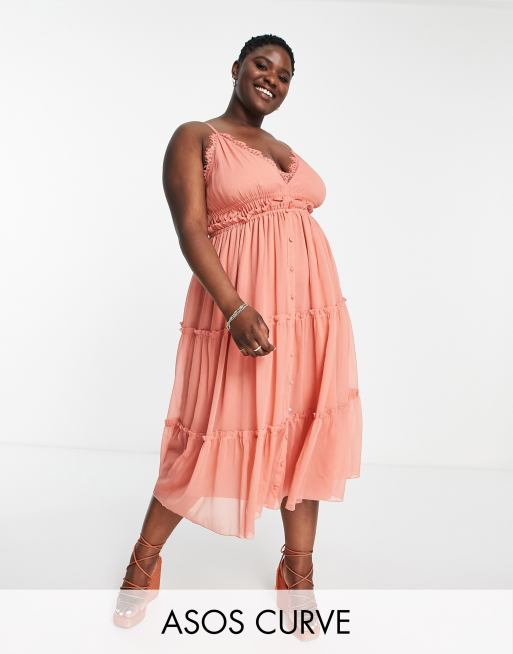 Vestido midi rosado escalonado con botones y detalle de ribete de encaje de ASOS DESIGN Curve