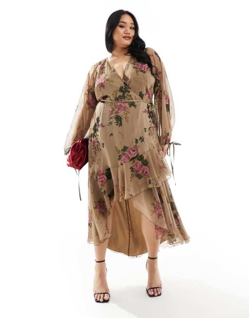Vestido midi verde cruzado de manga larga con estampado floral de chifón exclusivo de ASOS DESIGN Curve