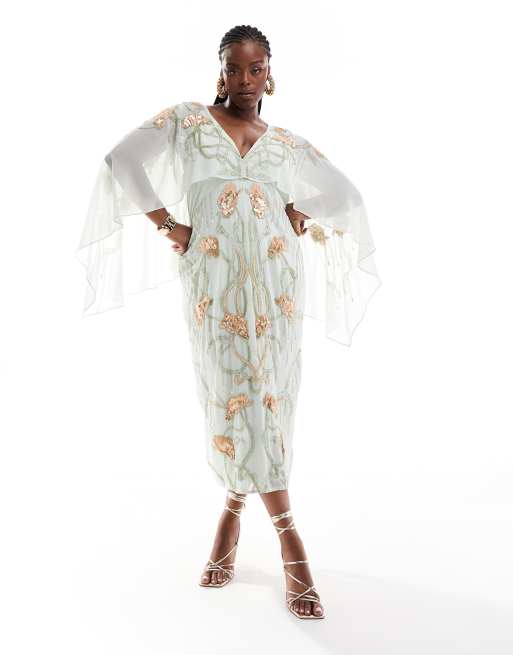 Vestido midi verde salvia con diseño floral de abalorios y detalle de capa de ASOS DESIGN Curve
