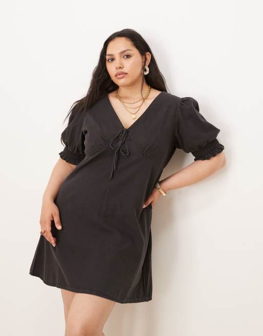 Vestido vaquero corto negro lavado con mangas abullonadas y detalle de volantes de denim suave de ASOS DESIGN Curve