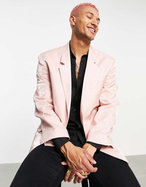 Americana larga rosa con hombreras de corte slim y satén arrugado de ASOS DESIGN