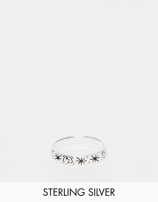 Anillo de banda con diseño grabado de calavera y estrella de plata de ley de ASOS DESIGN
