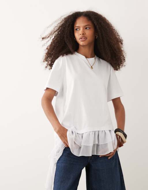 ASOS DESIGN - Camiseta blanca extragrande asimétrica con bajo de encaje de chifón