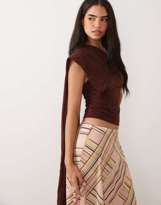 ASOS DESIGN - Top marrón chocolate elástico con detalle de fular de chifón