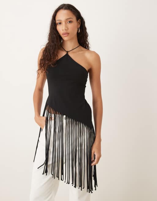 ASOS DESIGN - Top negro de corte alargado con cuello halter y flecos