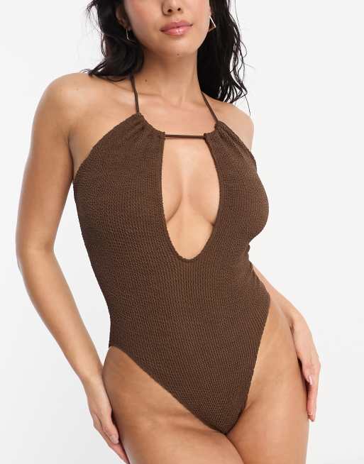Bañador marrón de pernera muy alta con cuello halter y abertura de tejido rugoso de ASOS DESIGN