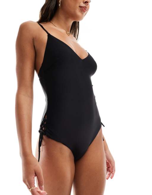 Bañador negro escotado con detalle de cordones laterales Samantha de ASOS DESIGN