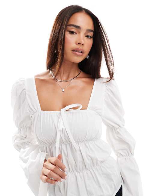 Blusa color crudo con detalles abullonados y fruncidos en las mangas de ASOS DESIGN