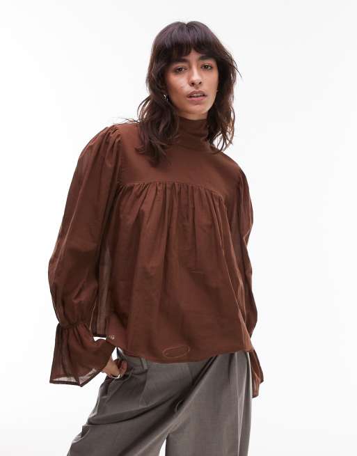 Blusa marrón chocolate con cuello alto y mangas estilo blusón de ASOS DESIGN