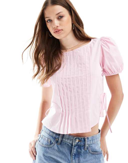 Blusa rosa con mangas abullonadas y jaretas de ASOS DESIGN