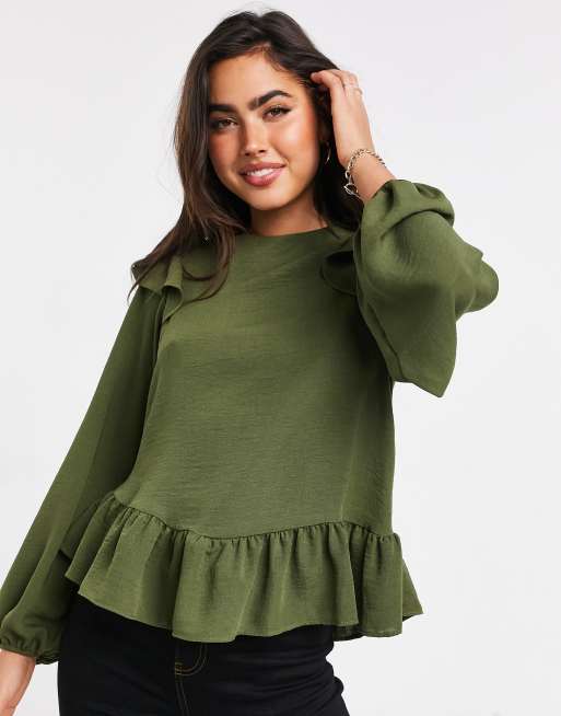 Blusa verde oliva de manga larga con detalle de volantes de ASOS DESIGN