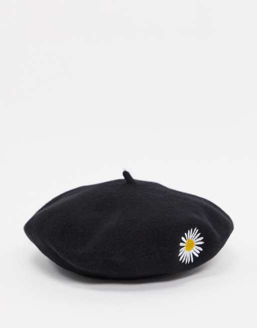 Boina negra de lana con margarita bordada de ASOS DESIGN