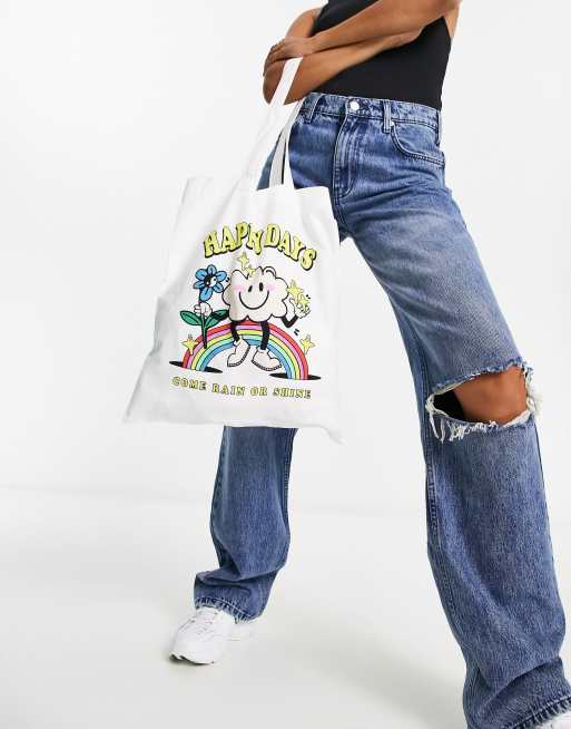 Bolso tote beis con estampado "Happy days" de algodón de ASOS DESIGN