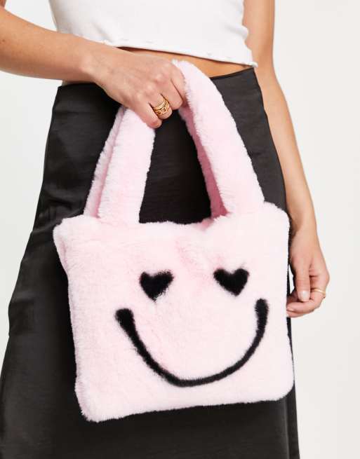 Bolso tote pequeño rosa con estampado de cara feliz de piel sintética de ASOS DESIGN
