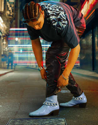 Botas Chelsea azules con cadena plateada y tacón cubano de cuero sintético acharolado de ASOS DESIGN