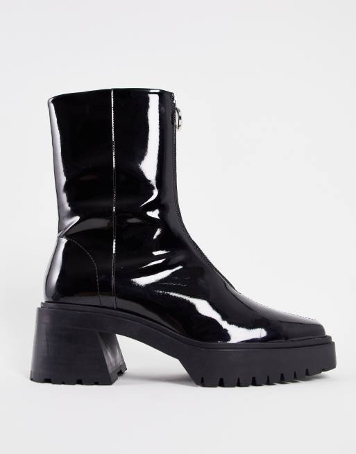 Botas Chelsea negras de tacón con suela gruesa, puntera cuadrada y cremallera en la parte delantera de charol de cuero de ASOS DESIGN