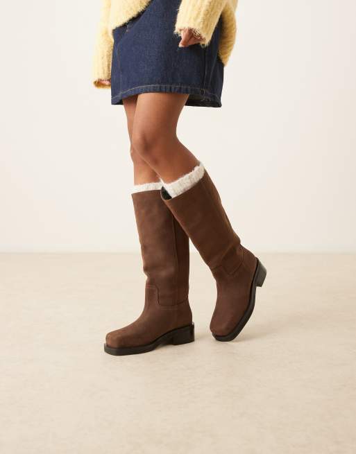 Botas por la rodilla marrón chocolate sin cierres de estilo camionero de nobuk de cuero Cynthia de ASOS DESIGN
