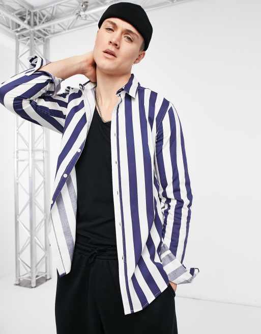Camisa azul marino y blanca a rayas elástica de corte slim de ASOS DESIGN
