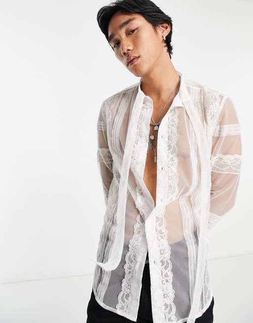 Camisa blanca transparente con lazo en el cuello y detalle de encaje de ASOS DESIGN