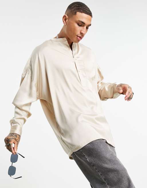 Camisa color champán extragrande sin aberturas con cuello mao de satén de ASOS DESIGN