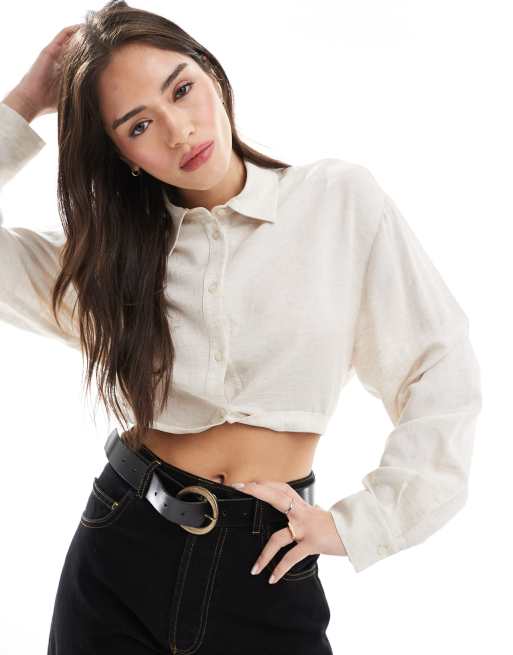 Camisa corta beis con bajo vuelto de tejido efecto lino de ASOS DESIGN