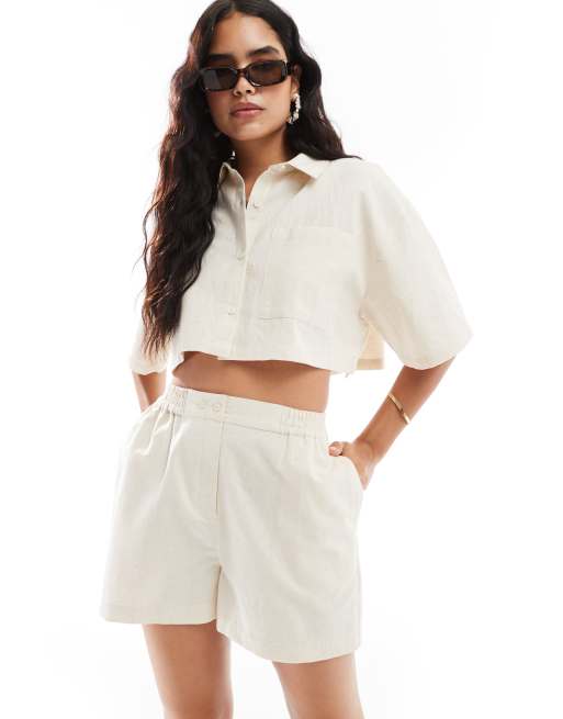 Camisa corta beis de tejido efecto lino de ASOS DESIGN (parte de un conjunto)