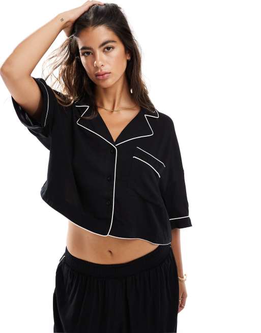 Camisa de pijama corta negra elegante con ribetes en contraste de tejido muy suave de ASOS DESIGN
