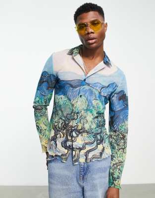 Camisa entallada elástica con estampado de cuadro de Van Gogh de malla de ASOS DESIGN