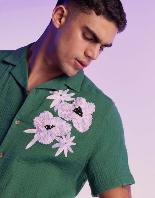 Camisa holgada con cuello de solapas, aplicación bordada a mano de flores y acabado rugoso de ASOS DESIGN