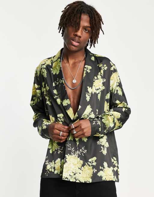 Camisa negra con doble botonadura en la parte delantera y estampado floral de satén de ASOS DESIGN