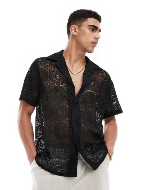Camisa negra holgada de manga corta con cuello de solapas de encaje de ASOS DESIGN