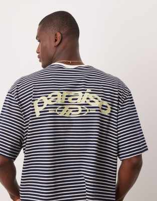 Camiseta a rayas blancas y negras de corte cuadrado extragrande con estampado trasero de ASOS DESIGN