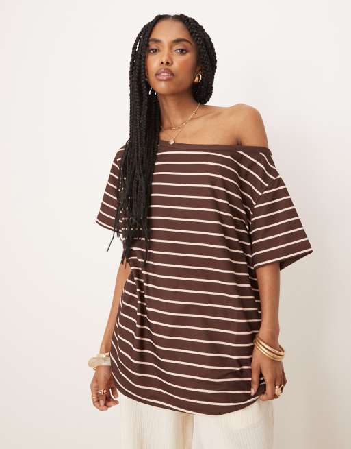 Camiseta a rayas rosas y burdeos suelta con escote Bardot de ASOS DESIGN