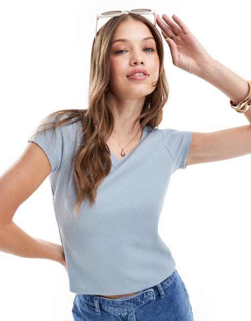 Camiseta azul claro de corte slim con mangas de casquillo y cuello de pico de punto de arroz de ASOS DESIGN