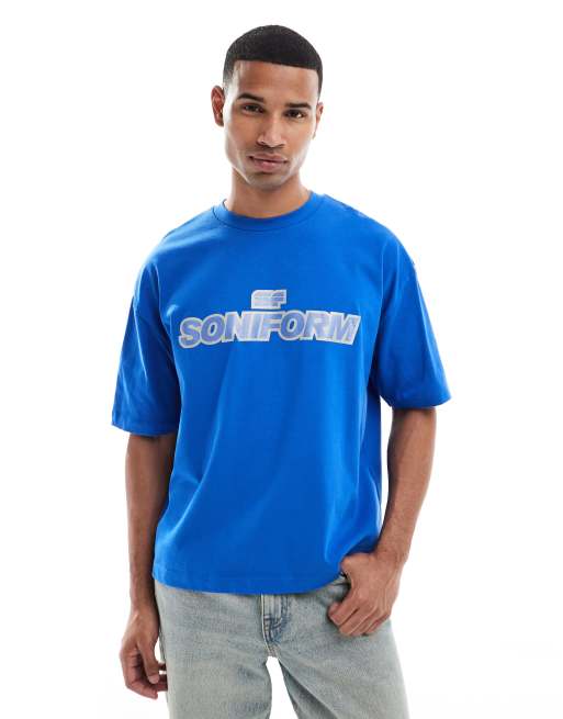 Camiseta azul de corte cuadrado extragrande con estampado gráfico en el pecho de tejido grueso de ASOS DESIGN