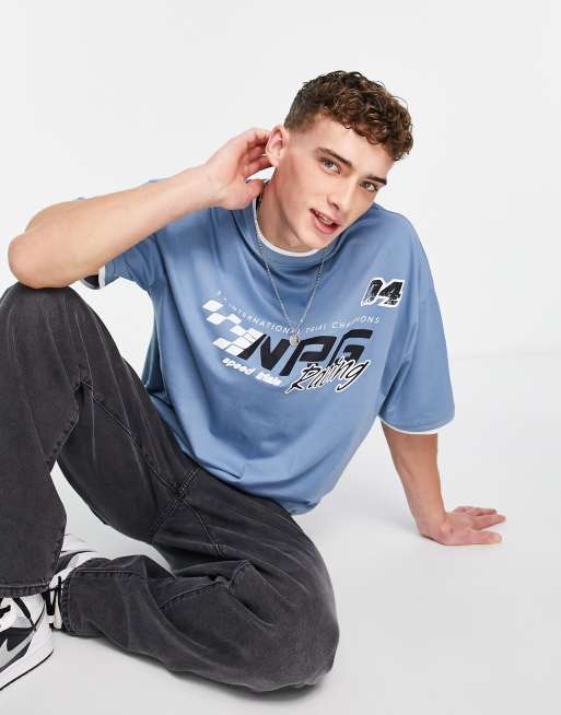 Camiseta azul extragrande con estampado de carreras en el pecho y detalle de ribetes de ASOS DESIGN