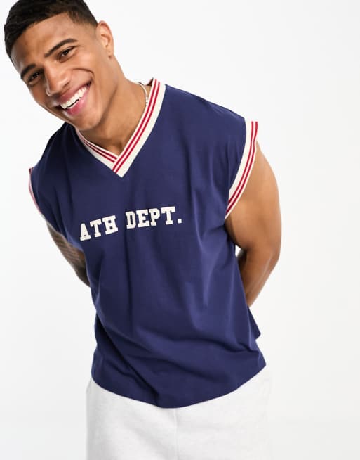 Camiseta azul marino sin mangas extragrande con estampado universitario de ASOS DESIGN