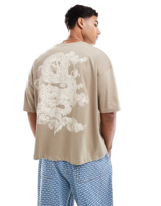Camiseta beis de corte cuadrado extragrande con estampado gráfico de dragón de ASOS DESIGN