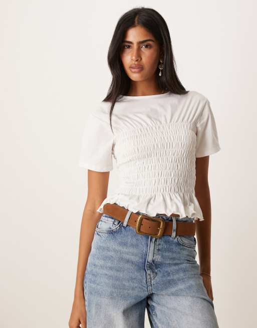 Camiseta blanco marfil entallada con detalle fruncido en la cintura de algodón de ASOS DESIGN