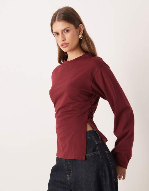 Camiseta burdeos de manga larga con cintura entallada y abertura lateral en el bajo de ASOS DESIGN