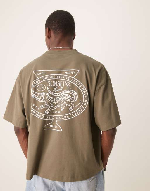 Camiseta caqui de corte cuadrado extragrande con estampado trasero de ciudad de ASOS DESIGN