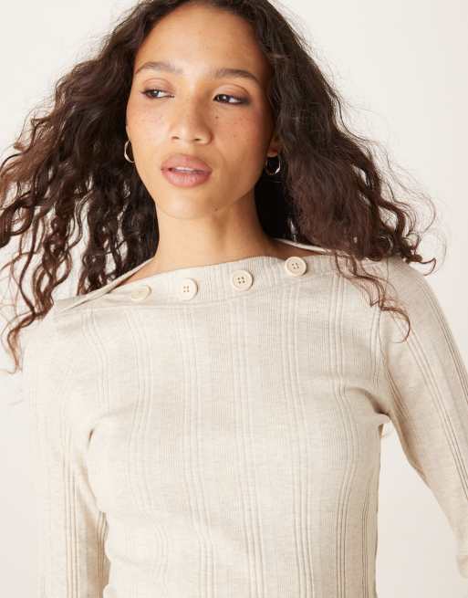 Camiseta color crema de manga larga con detalle de botones de canalé ancho de ASOS DESIGN