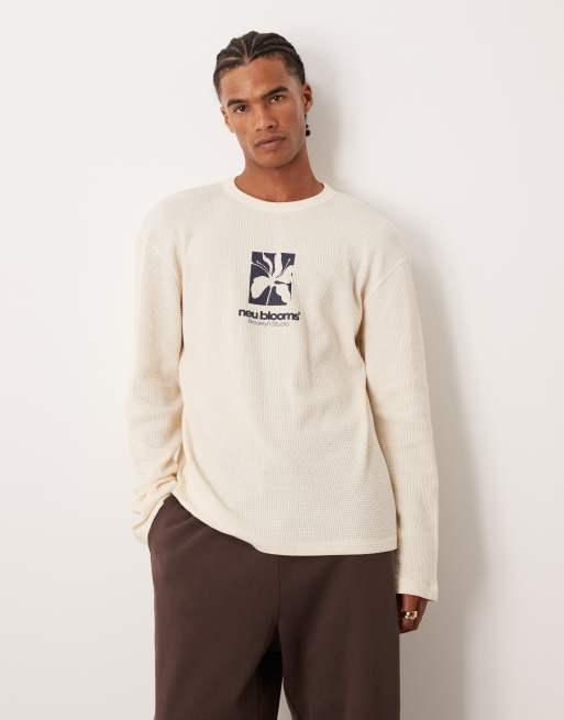 Camiseta color crema extragrande de manga larga con gráficos posicionales de punto grueso gofrado de ASOS DESIGN